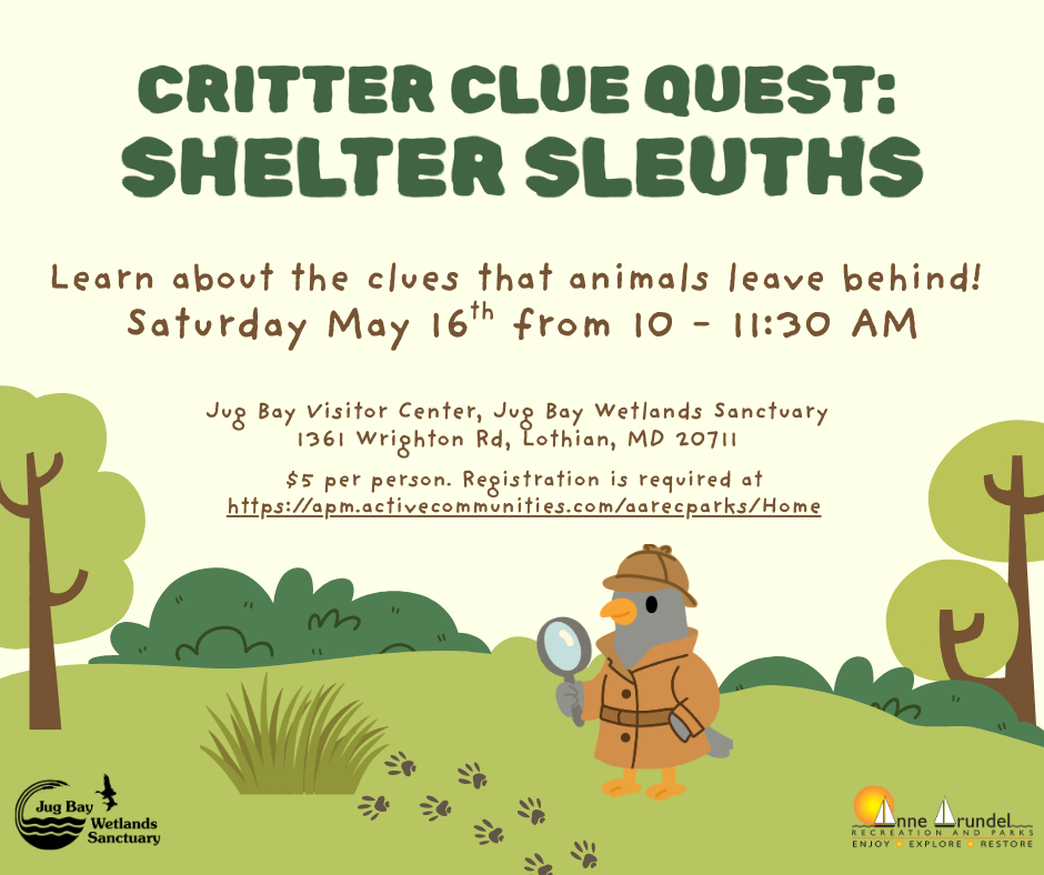 In this hands-on program, kids explore replica nests, examine burrows and dens, compare building materials, and unravel the clues left behind by nature’s most clever construction crews. After cracking the case of “Who Built This Home?” we’ll take a short walk to discover real wildlife shelters hidden throughout Jug Bay. Fee $5 per person. No refunds for participant cancellation or no shows. Open to all families. Register each person attending. Under 18 must be accompanied by an adult. Register each person attending. Registration is required at https://apm.activecommunities.com/aarecparks/Home Activity Net #44375. For questions, call 410-222-8006 or email jugbay@aacounty.org.