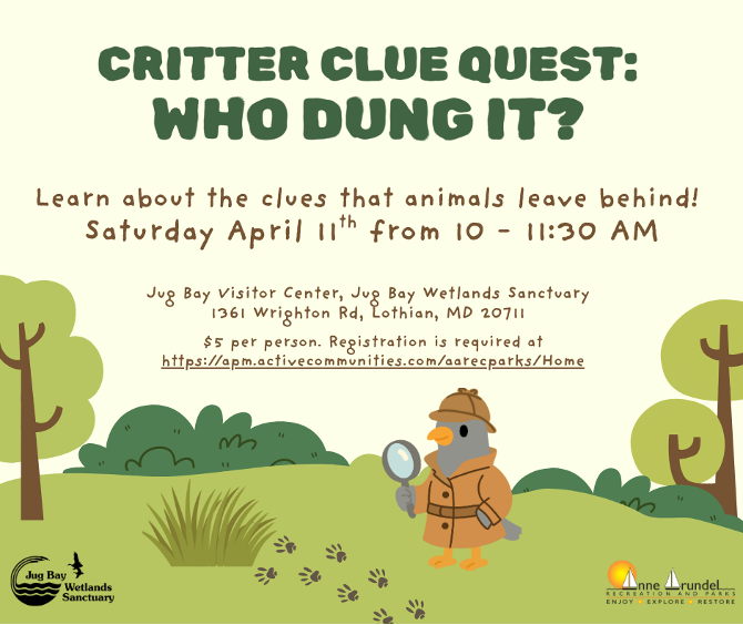 Young wildlife detectives return for another mystery-filled mission. Animals may leave tracks, but they also leave behind another important clue: scat. In this messy, but exciting adventure, kids will investigate ransacked campsite scenes, study realistic scat replicas, and learn how biologists identify which animals have been sneaking around- all without ever seeing the creatures themselves! Using observation, comparison, and deduction, junior sleuths will crack the case of “Who Dung It?” and discover that evidence of animals is all around us. Even the stinky kind. Fee $5 per person. No refunds for participant cancellation or no shows. Open to all families. Under 18 must be accompanied by an adult. Registration is required at https://apm.activecommunities.com/aarecparks/Home Activity Net #44342. For questions, call 410-222-8006 or email jugbay@aacounty.org.